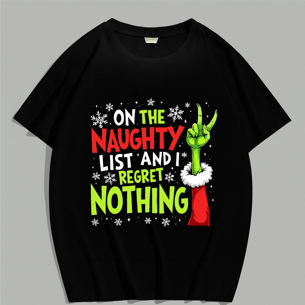 "Naughty List & Regret Nothing" Christmas Graphic Tee – Black Unisex T-Shirt